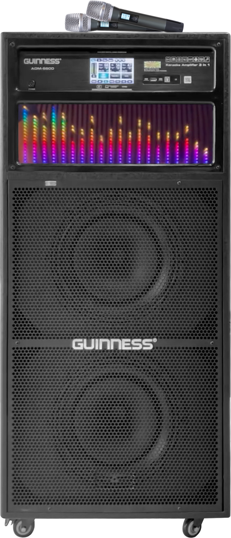 Với lớp vỏ ngoài bằng hợp kim cao cấp và lưới ê căng chắc chắn, GUINNESS-1355 vừa bền bỉ, vừa sang trọng. Bánh xe đi kèm giúp việc di chuyển loa trở nên dễ dàng hơn, dù trong nhà hay ngoài trời.